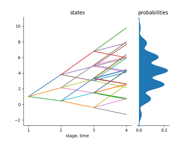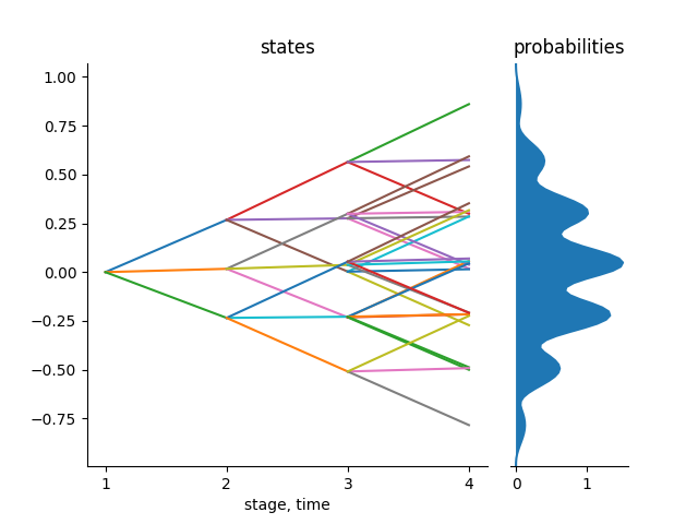 Consider the following example. We want to approximate a Gaussian random walk of 4 stages in one dimension with a scenario lattice with the branching structure of 1x3x4x5 and 1,000,000 iterations.